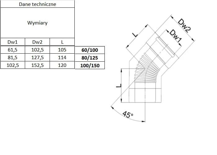Kolano 45° System Turbo Dwuścienny Kwasoodporne